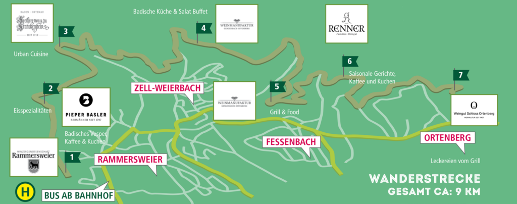 An jeder der sieben Stationen gibt es die Weine der jeweiligen Winzer, alkoholfreie Getränke sowie wechselnde Speisen: Urban Cuisine, Badische Küche & Salat Buffet, Grill & Food, Badisches Vesper, Kaffee & Kuchen, Eisspezialitäten, Saisonale Gerichte und Leckereien vom Grill.