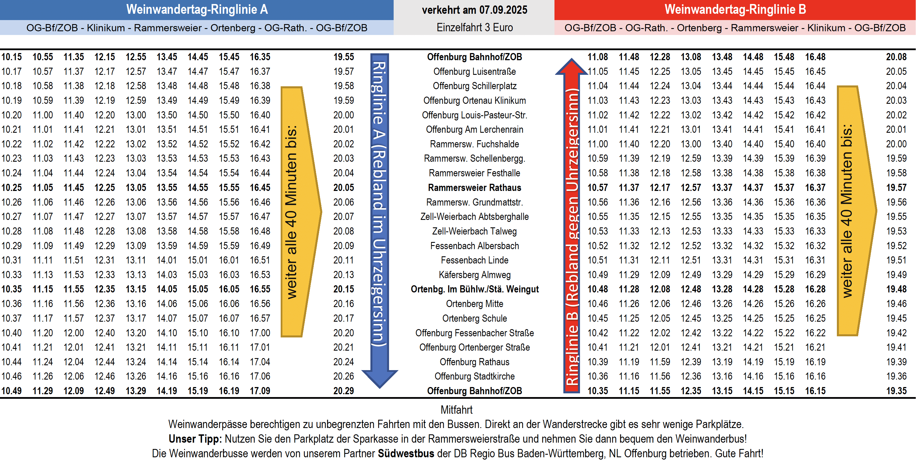 Entlang der Wanderstrecke verkehrt ein bequemer Bus-Shuttle zwischen den Stationen. Die Haltestellen sind gut ausgeschildert, der Fahrplan ist per QR-CODE abrufbar und hängt an den Stationen aus. Der Bus verbindet die Stationen auch mit dem Offenburger Bahnhof. Ein Einzelticket kostet 3 Euro (ab 15 Jahren). Beim Kauf eines Weinwandertagpasses wird Ihnen dieser Betrag erstattet und alle Busfahrten sind im Preis inbegriffen.