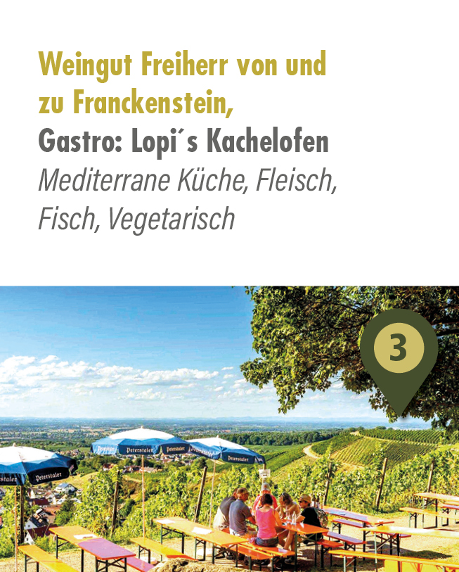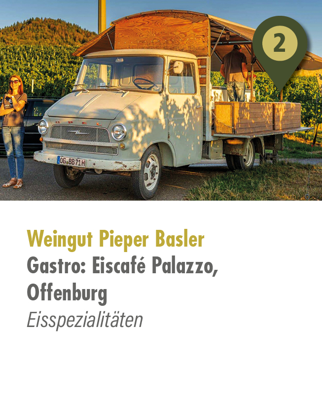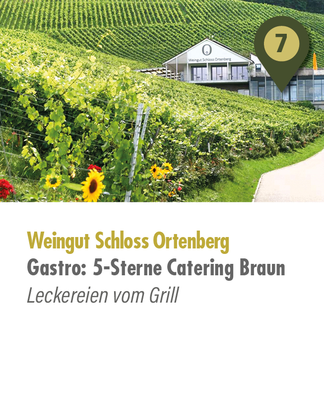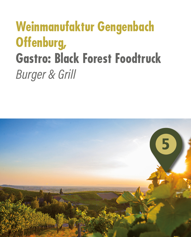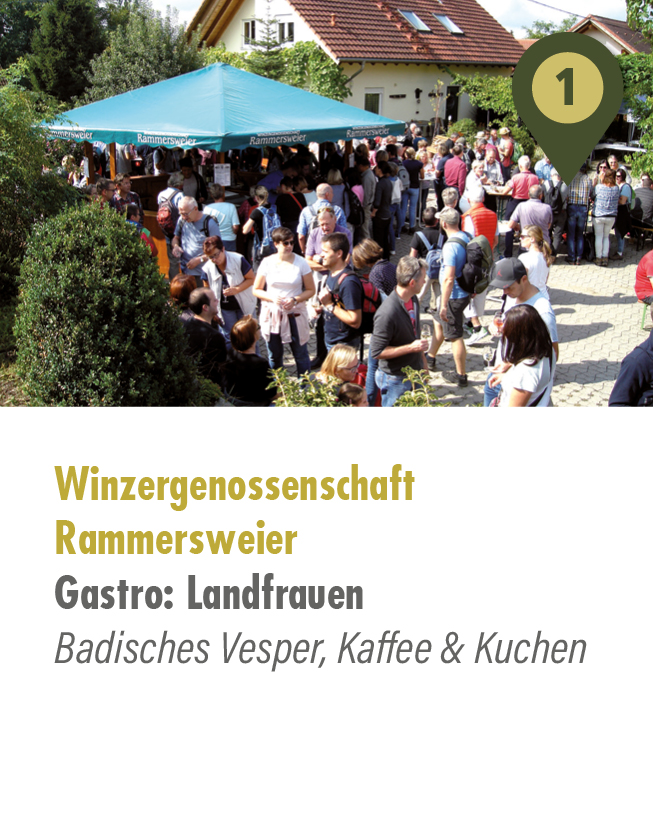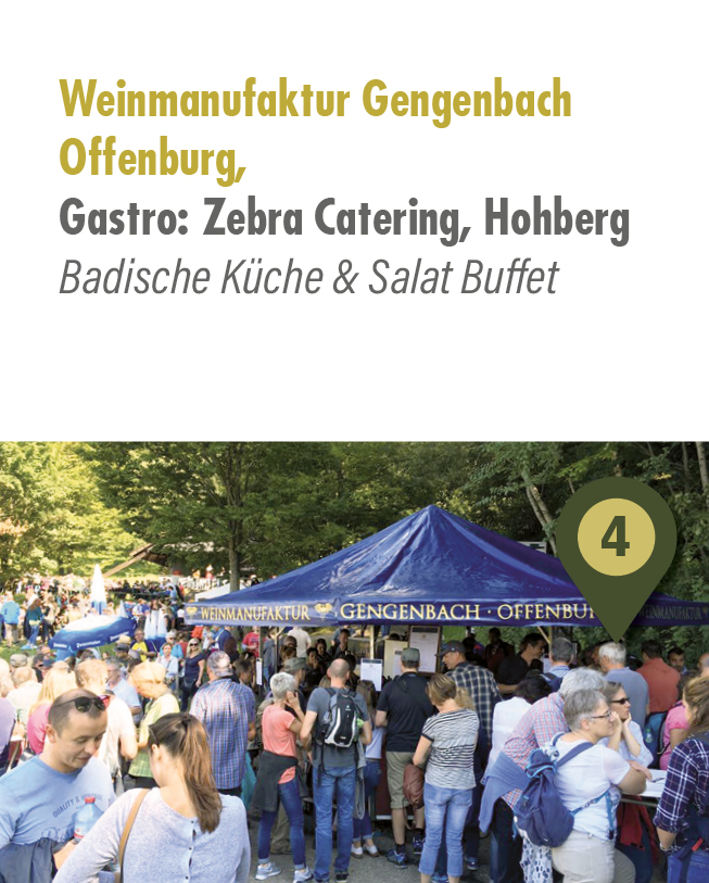 An jeder der sieben Stationen gibt es die Weine der jeweiligen Winzer, alkoholfreie Getränke sowie wechselnde Speisen: Urban Cuisine, Badische Küche & Salat Buffet, Grill & Food, Badisches Vesper, Kaffee & Kuchen, Eisspezialitäten, Saisonale Gerichte und Leckereien vom Grill.
